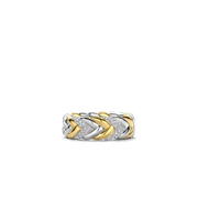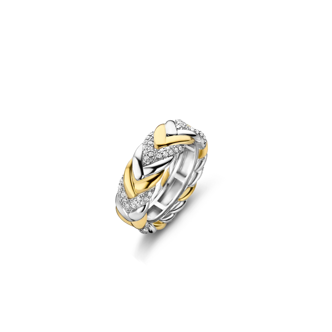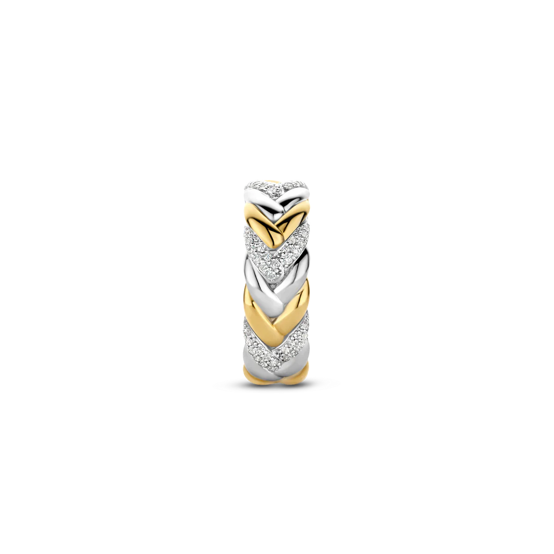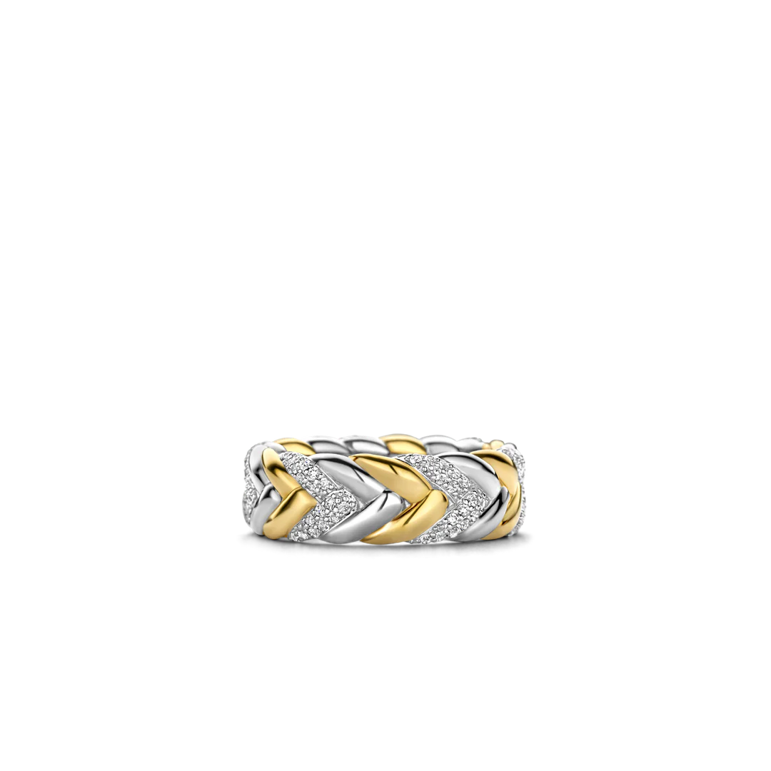 This TI SENTO gold-plated silver ring 12263ZY features an elegant, braided pattern that intertwines silver, pavé and gold-plated silver. The ring is crafted from 925 sterling silver and coated with a thick layer of platinum to protect it and keep it luminous. A classic design with a playful twist.